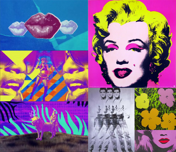 Depuis quelques mois on aperçoit du « pop art » dans les clips. Déco, stylisme, coiffures, couleurs, techniques de l’images sont empruntés aux plus grandes icônes américaines de ce mouvement artistique.