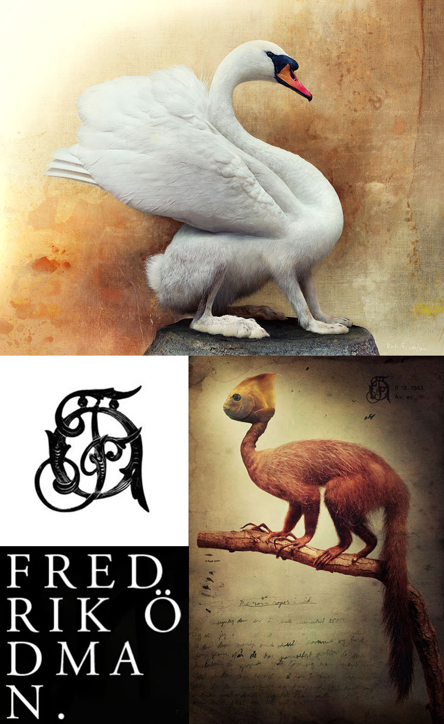 Fredrik Ödman est un photographe suédois de 30 ans assez original. Fan d’Erwin Olaf et de Linda Bergkvist , il crée par photomontage, des animaux monstrueusement beaux.