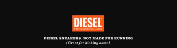 Pour sa dernière campagne de pub, la marque Diesel mise une fois de plus sur l’originalité. Contrairement aux autres baskets, les baskets de Diesel n’ont pas été conçues pour courir mais pour botter les fesses ! (Not made for running. Great for kicking asses)