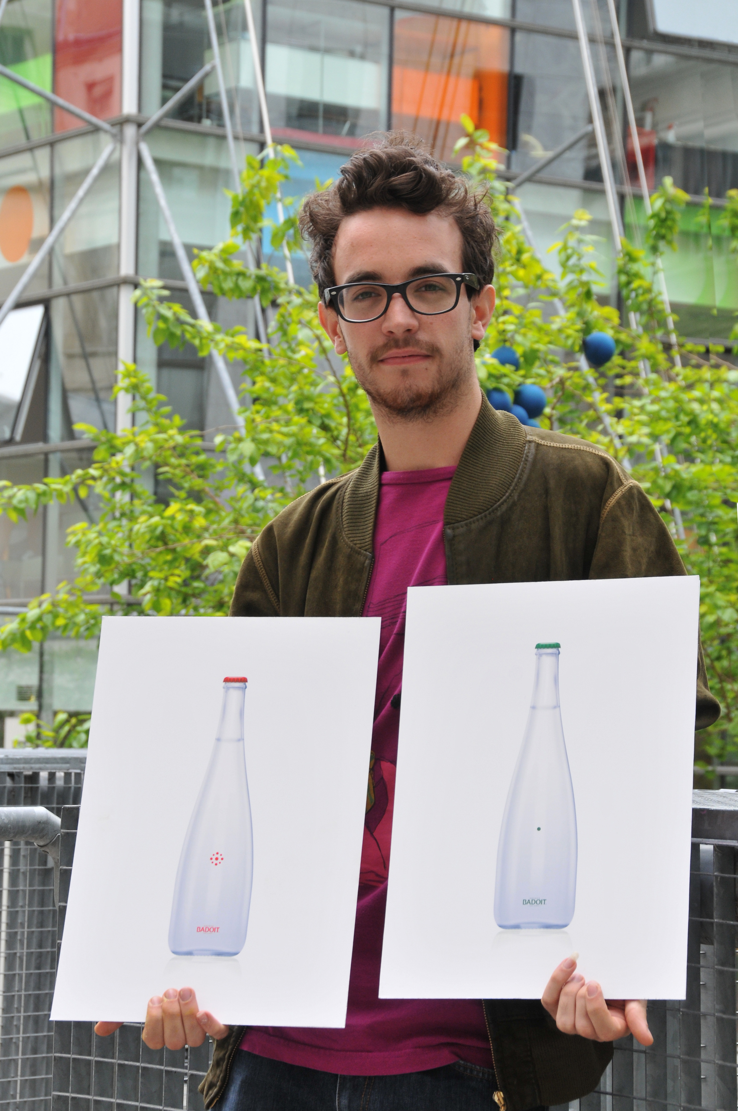 Le lauréat, très inspiré par les bulles de Badoit les décline dans une création chic et festive. Un travail tout en légèreté et en gaîté pour des bouteilles très collector.