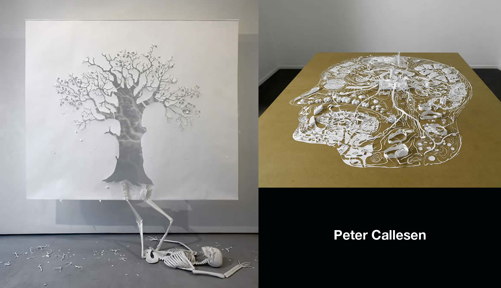Peter Callesen est un sculpteur danois de 43 ans qui travaille sur du papier. Il a mis au point un processus magique qui matérialise un papier plat vers une forme en relief. Allant plus loin que l’origami avec ses pliages, Peter Callesen, découpe, déchire, colle, roule, attache, pique le tout avec une précision incroyable.