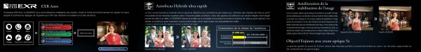 – Capteur EXR de 12 mégapixels 1/2″ – Objectif 5x équivalent 35-175mm – Stabilisation d’image mécanique, par translation du capteur – Modes EXR : – Mode HR (haute résolution) – Mode DR (Dynamic Range) – Mode SN (Haute sensibilité et bruit limité) – Sensibilité : 100 à 3200 ISO – Autofocus hybride : – par détection de phase (type reflex) – par détection de contraste – Vidéo HD 1280 x 720 pixels 24 i/s en AVI et son mono – Détection et reconnaissance des visages – Ecran LCD tactile 3,5″ / 460 000 pixels – Fonction panorama 360 par balayage (verticalement aussi) – Flash intelligent avec prise en compte de la stabilité pour les obturations lentes – Détection des chiens et chats – Prise de photo de bébé automatique – Cartes SD et SDHC – 98,1 x 59,0 x 20,3 mm – Poids : 141 grammes sans batterie – Tarif : 199 euros TTC