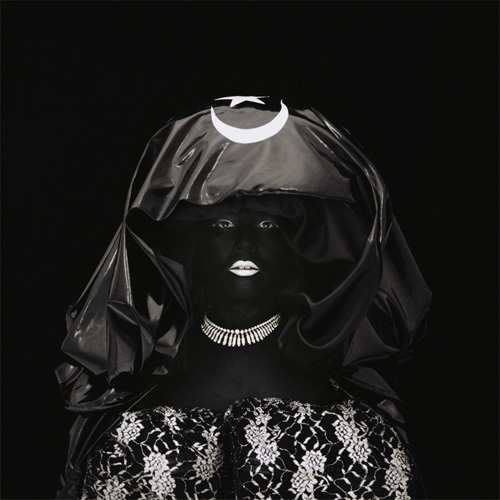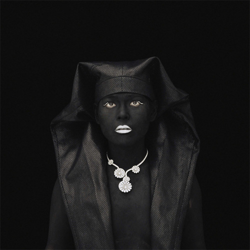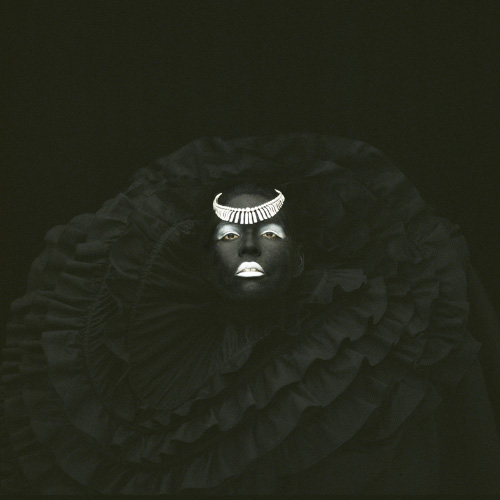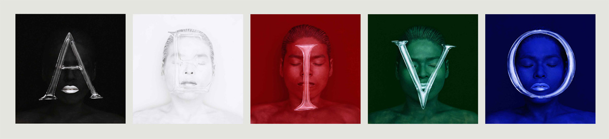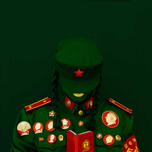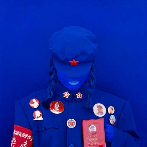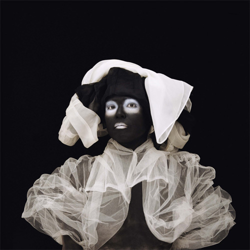 La monochromie permet de mettre en valeur des accessoires avec lesquels elle se met en scène tels que des lettres de l’alphabet, des coiffes traditionnels japonaises ou africaines mais également des masques d’Opéra Japonais.