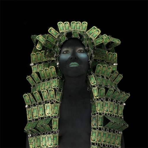 Ancienne créatrice de mode, Kimiko Yoshida s’approprie, dans une riche série de 80 œuvres, les créations haute couture de Paco Rabanne. Elle transforme robes, jupes, accessoires, pantalons et chaussures, en coiffes Grand Siècle, parures antiques et autres costumes historiques.