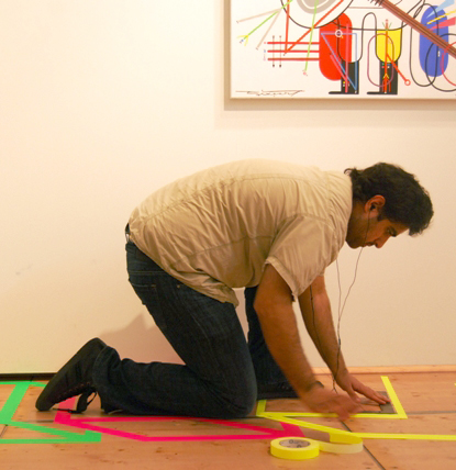 Se servant du paysage urbain, son jeu d’illusion fait de bandes autocollantes, entraîne le spectateur dans des espaces virtuels. Aakash Nihalani peut aussi bien transformer la perception d’un plan qui passe en trois dimensions que jouer avec les espaces libres pour en modifier l’accès.