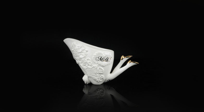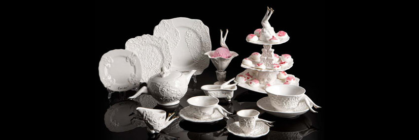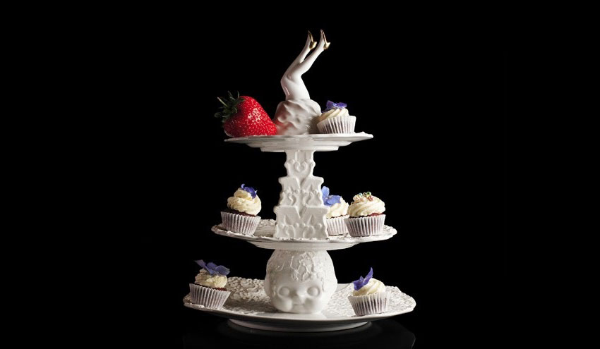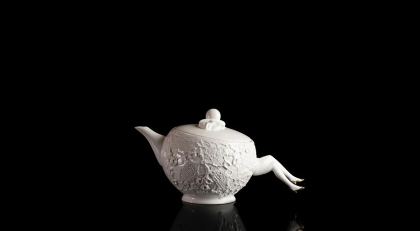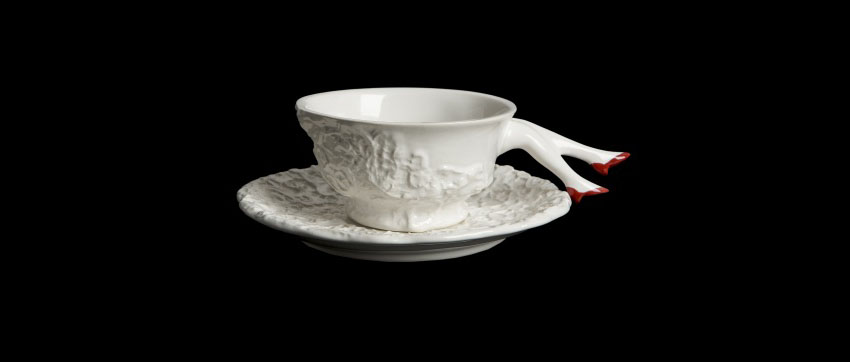 Voici un service à thé plutôt bizarre pour la marque Undergrowth Design de Londres. La collection Blaue Blume se compose d’une théière, d’un pot à lait, de tasses, d’un présentoir à gâteau… :