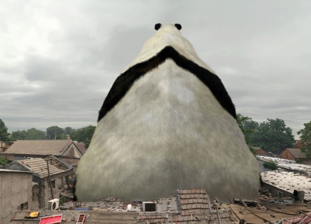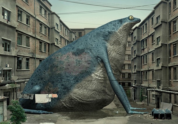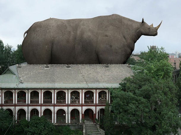 Pour sa série de trois images, Liu Di a choisi de représenter trois animaux différents : un rhinocéros, un lapin et une biche intégrés dans un univers urbain.