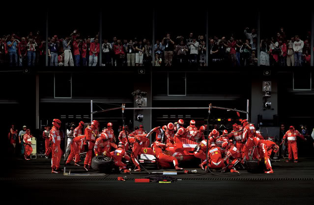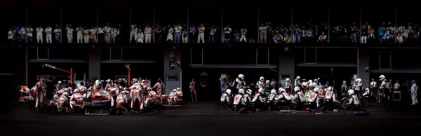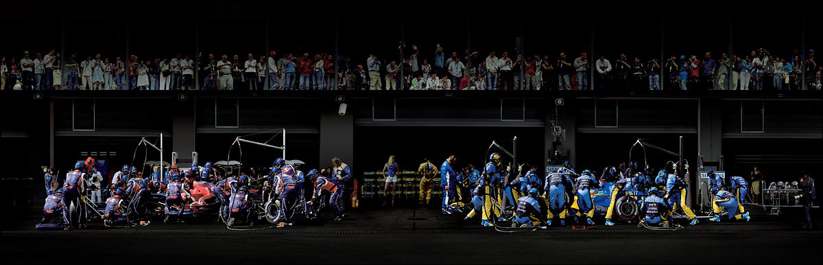 F1, Boxenstopp I » (2007) : Le photographe allemand Andreas Gursky a du se battre longtemps pour avoir le droit de photographier ces moments car ce milieu est sujet à l’espionnage industriel. Les personnages en combinaisons sont complètement figés et le contraste des couleurs des équipes est juste sublime.
