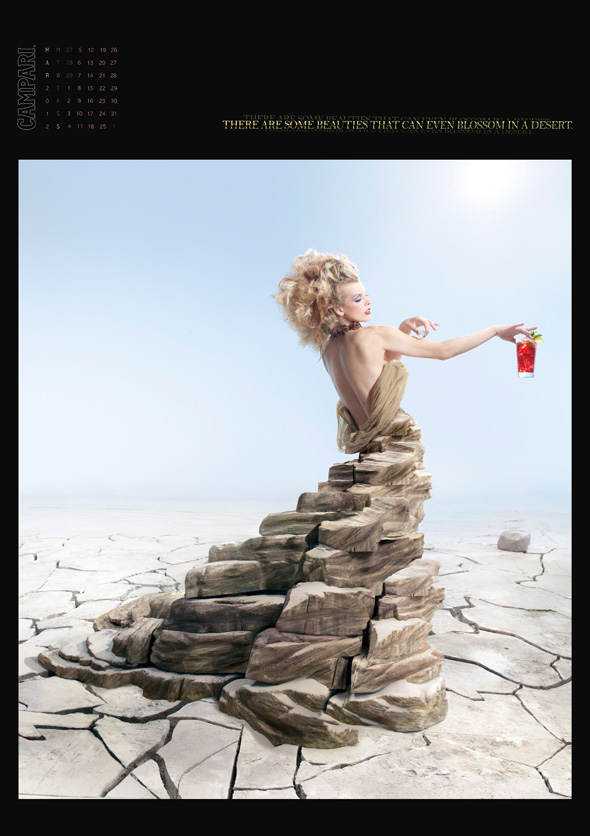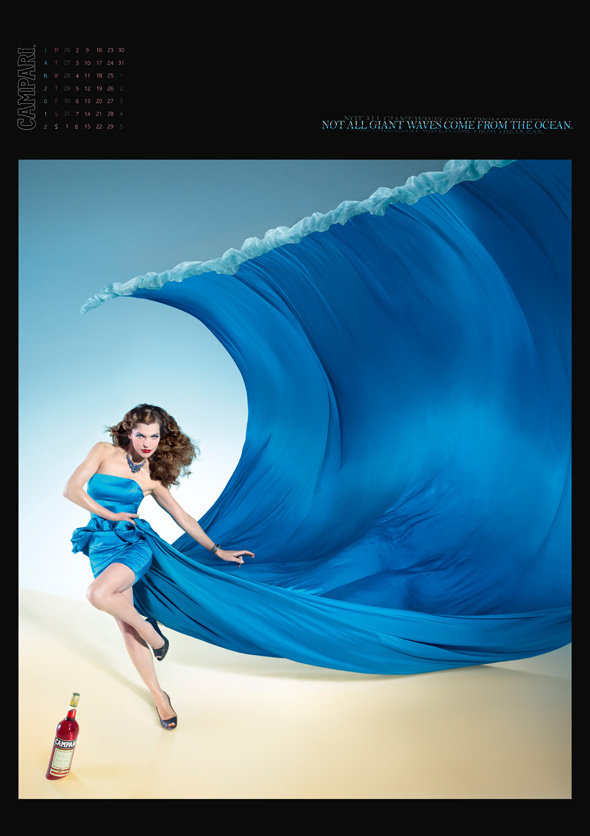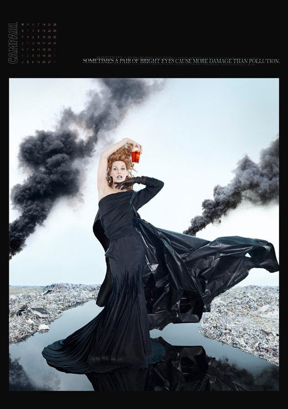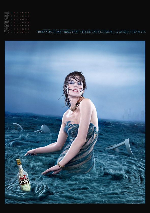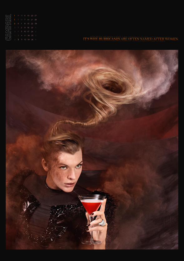 Il y a une ancienne prophétie maya qui dit que le 21 Décembre 2012 sera le jour de la fin du monde. Compte tenu de fait, Campari a demandé à l’actrice Milla Jovovich d’illustrer pour cette nouvelle année, un calendrier spécial : l’actrice prend la pose chaque mois avec une tenue qui fait référence à une cause possible de cette fin. Les photos sont shootées par Dimitri Daniloff et la direction artistique vient de l’agence de publicité Euro RSCG Italie.