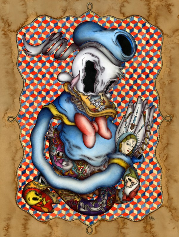 Nicolas Le Borgne (Odö) est un jeune illustrateur français qui s’inscrit dans le mouvement pop surréaliste. Il s’inspire autant du street art, du tatouage que de ses rêves étranges. Ses œuvres sont plutôt de petites tailles mais incroyablement riches en précision et en symbolique. L’univers d’Odö fait déjà le tour de la planète depuis plusieurs années pour la marque de surf Billabong,