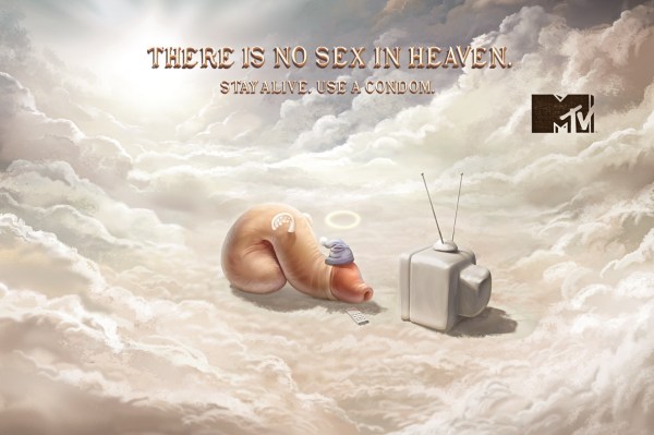 Il n’y a pas de sexe au Paradis ! . Cette campagne contre le SIDA a été réalisée par l’agence Loducca pour la chaîne MTV qui est très engagée auprès des jeunes. Ces prints ont été affichés au Brésil et ont pour but de sensibiliser les jeunes sur le port du préservatif .
