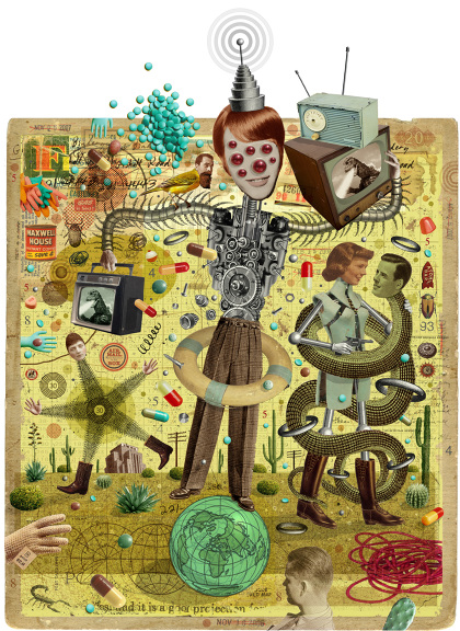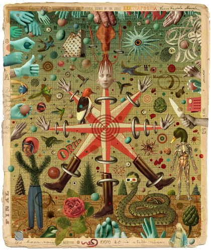 « Je vois le collage comme une forme de recyclage. J’essaie de construire quelque chose de nouveau et d’inattendu par la superposition d’éléments. Des bouts de texte, photos, de livres, magazines, des dessins ainsi que des articles récupérés… »