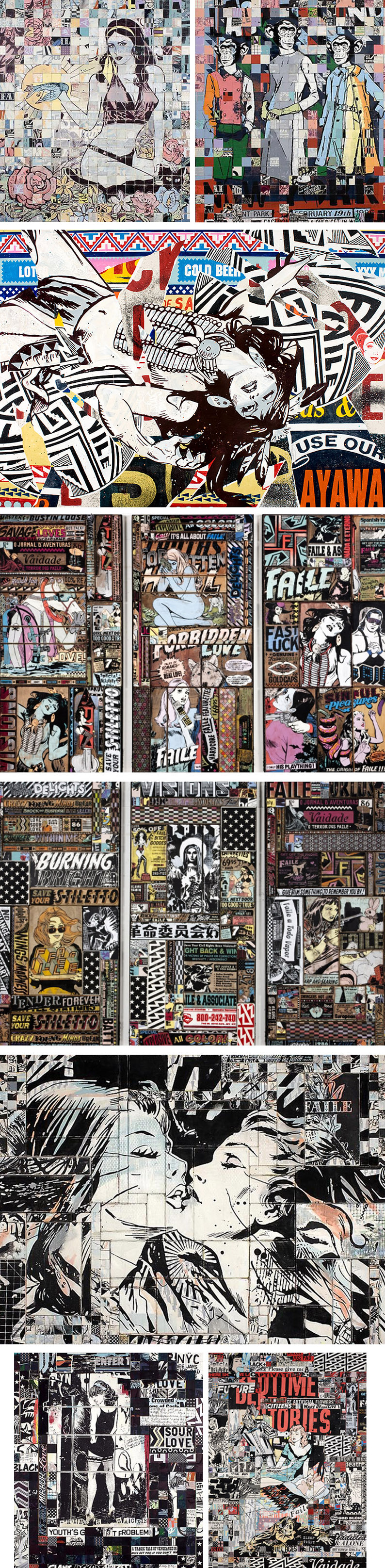 Ils ont progressé dans le milieu du graffiti au pochoir. Les images des affiches et les pochoirs de la culture pop ont permis à Faile de se diversifier dans d’autres domaines englobant sculpture, design, mode, musique, et articles de maison.