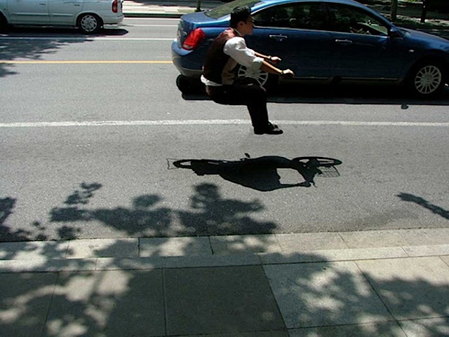 Zhao Huasen est un artiste chinois né à Dalian dans la province du Liaoning. Il a réalisé une série de photos « floating » où il a photographié des centaines de cyclistes. Les images sont ensuite retouchées pour enlever le vélo tout en gardant l’ombre portée au sol. Les photos sont assez drôles, illustrant des individus entrain de flotter dans la rue.